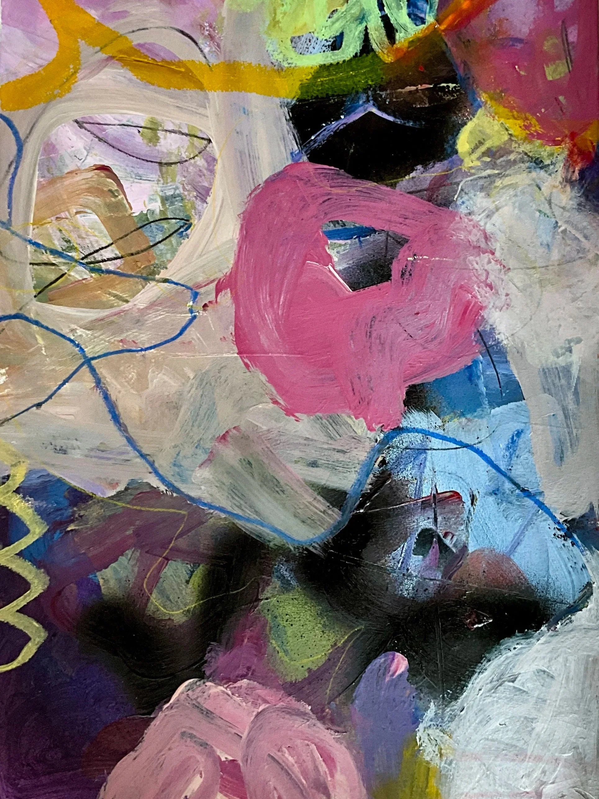 Each painting starts with a loose intention and develops with intuitive brushstrokes. Layers of acrylic paint, charcoal, pencil, and pastels build upon one another, with each mark and texture contributing to the piece’s unfolding story. The process is one of experimentation, of pushing boundaries and responding to what feels true in the moment. As I work, a delicate balance of composition, color, movement, and expression emerges, and with it, the painting finds its own unique form and voice.